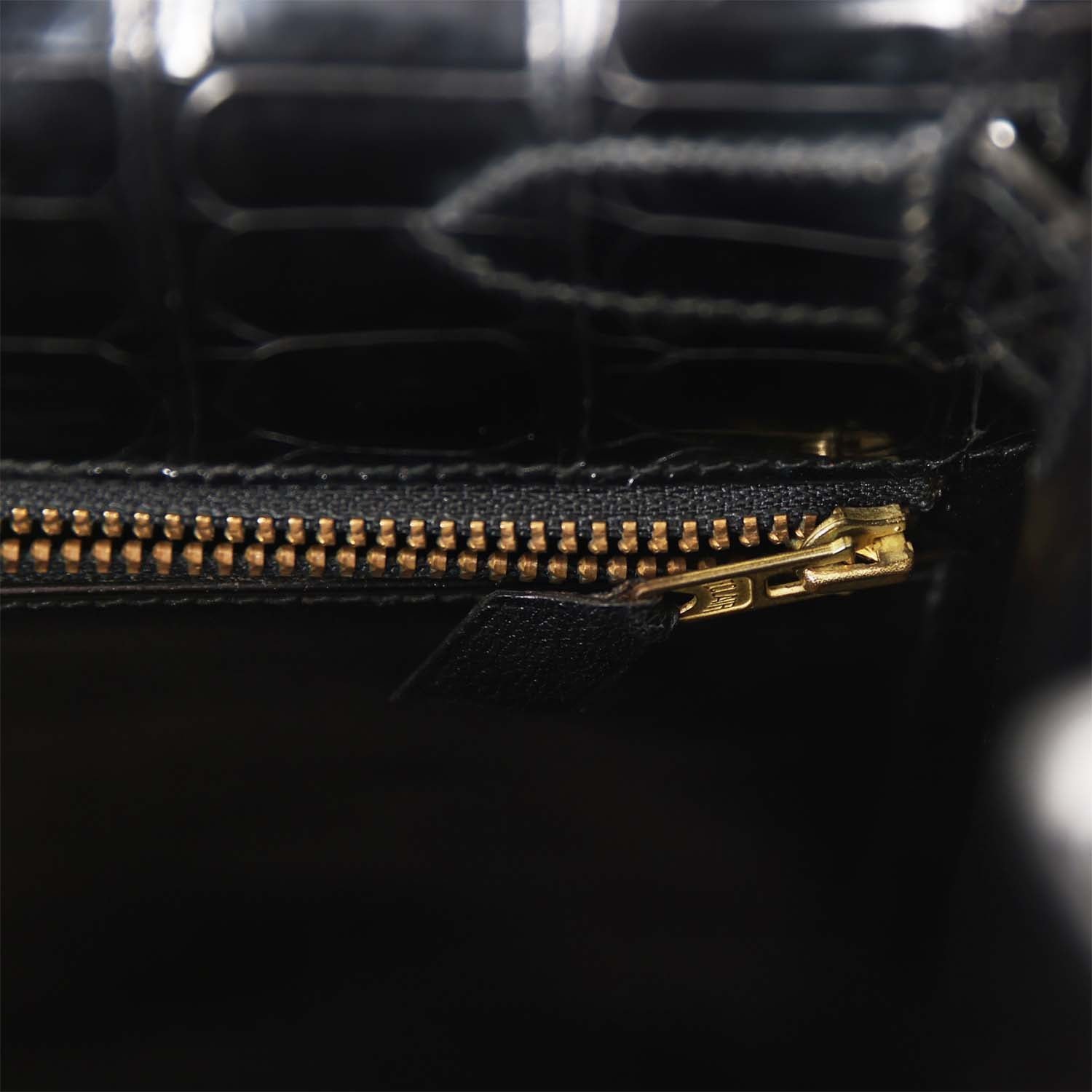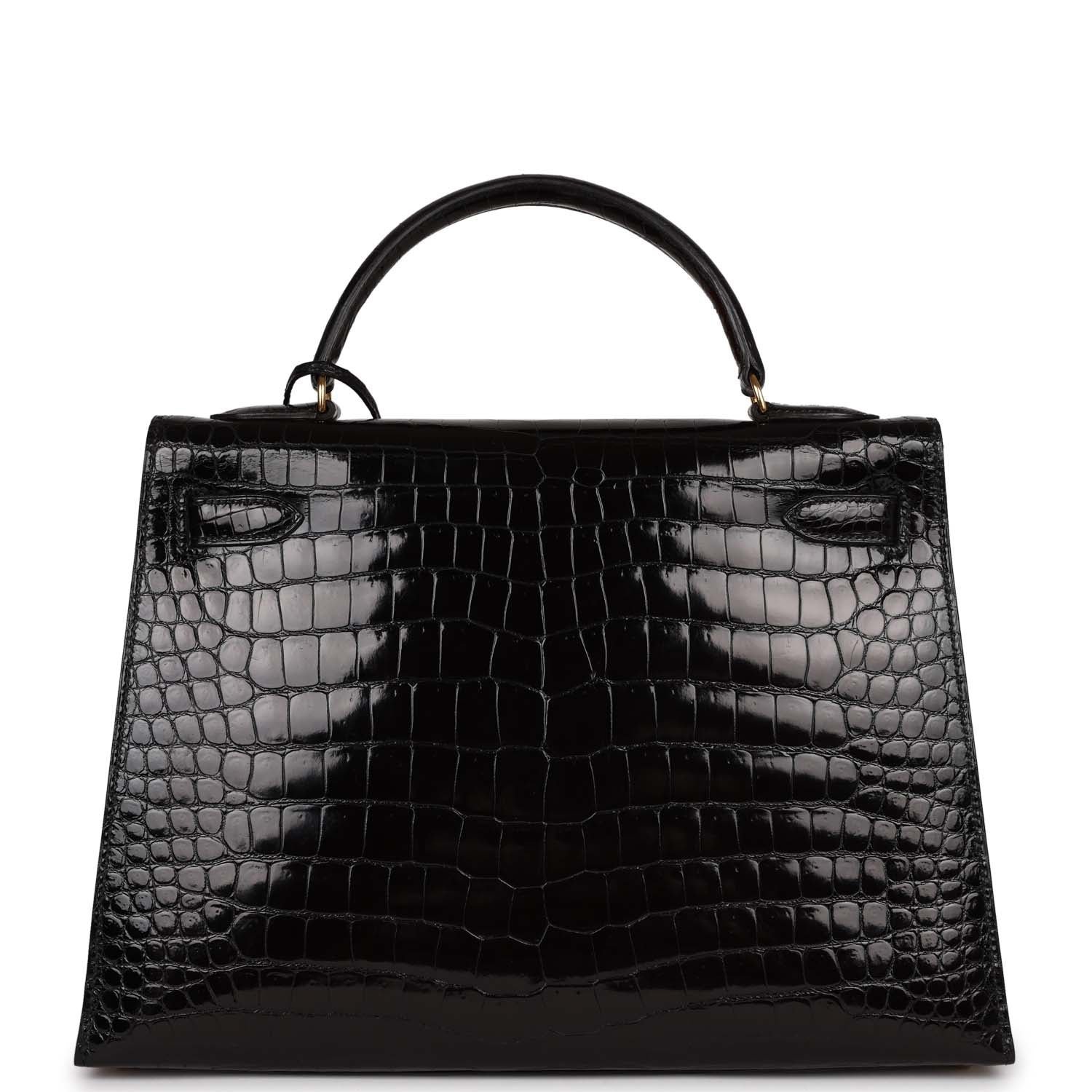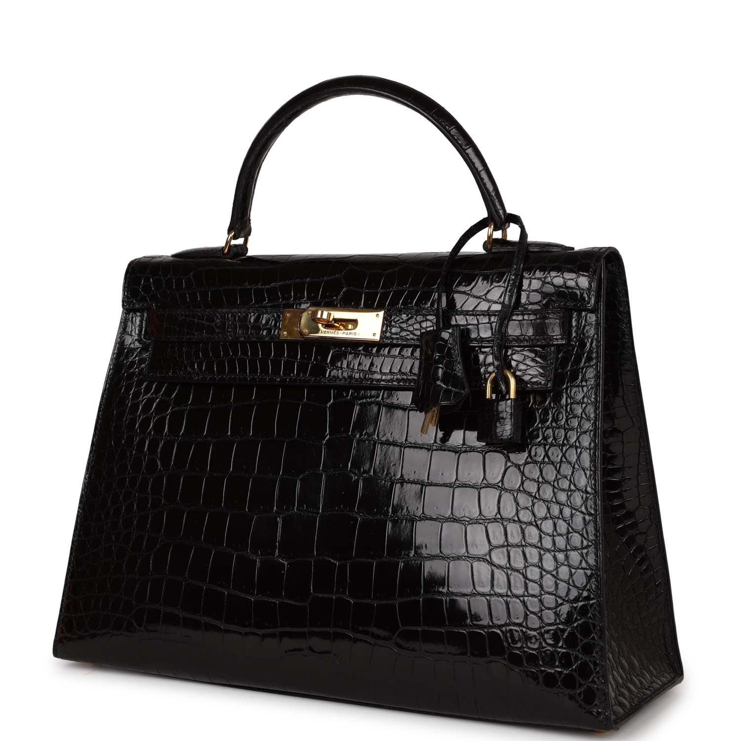 This Kelly is in Black shiny niloticus crocodile with gold hardware and features tonal stitching, a front toggle closure, a clochette with lock and two keys and a single rolled handle.